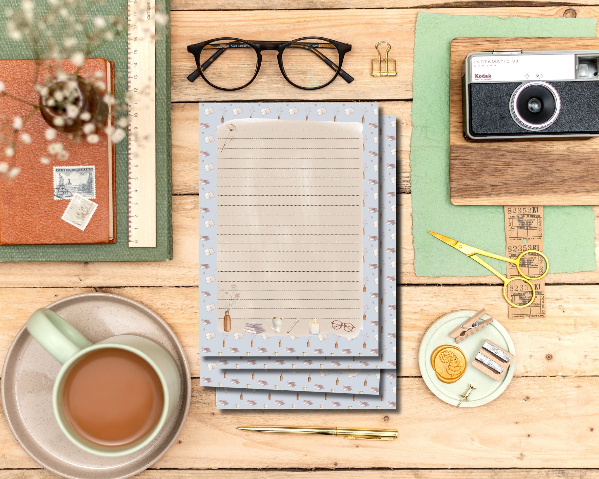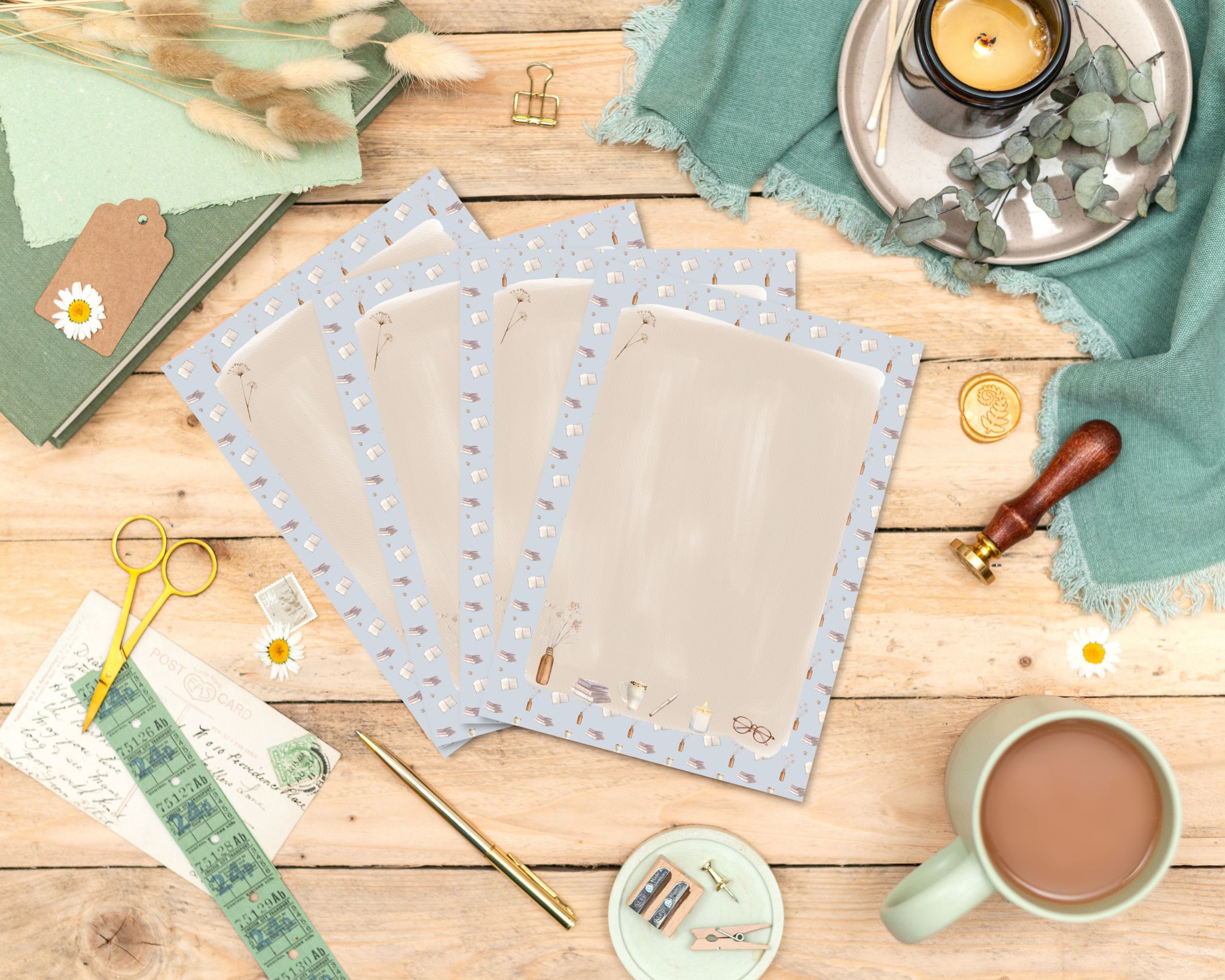 Step into a world of cosy reading vibes with Chapter & Charm 📖🕯️💙. This calming blue A5 writing paper is sprinkled with charming illustrations of books, a glowing candle, glasses, and all the little things that make a reading nook feel perfect.