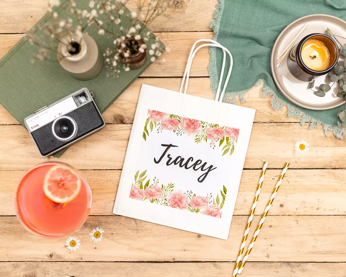 – 1 x personalised white paper bag measuring approx 19cm w x 21.5cm h