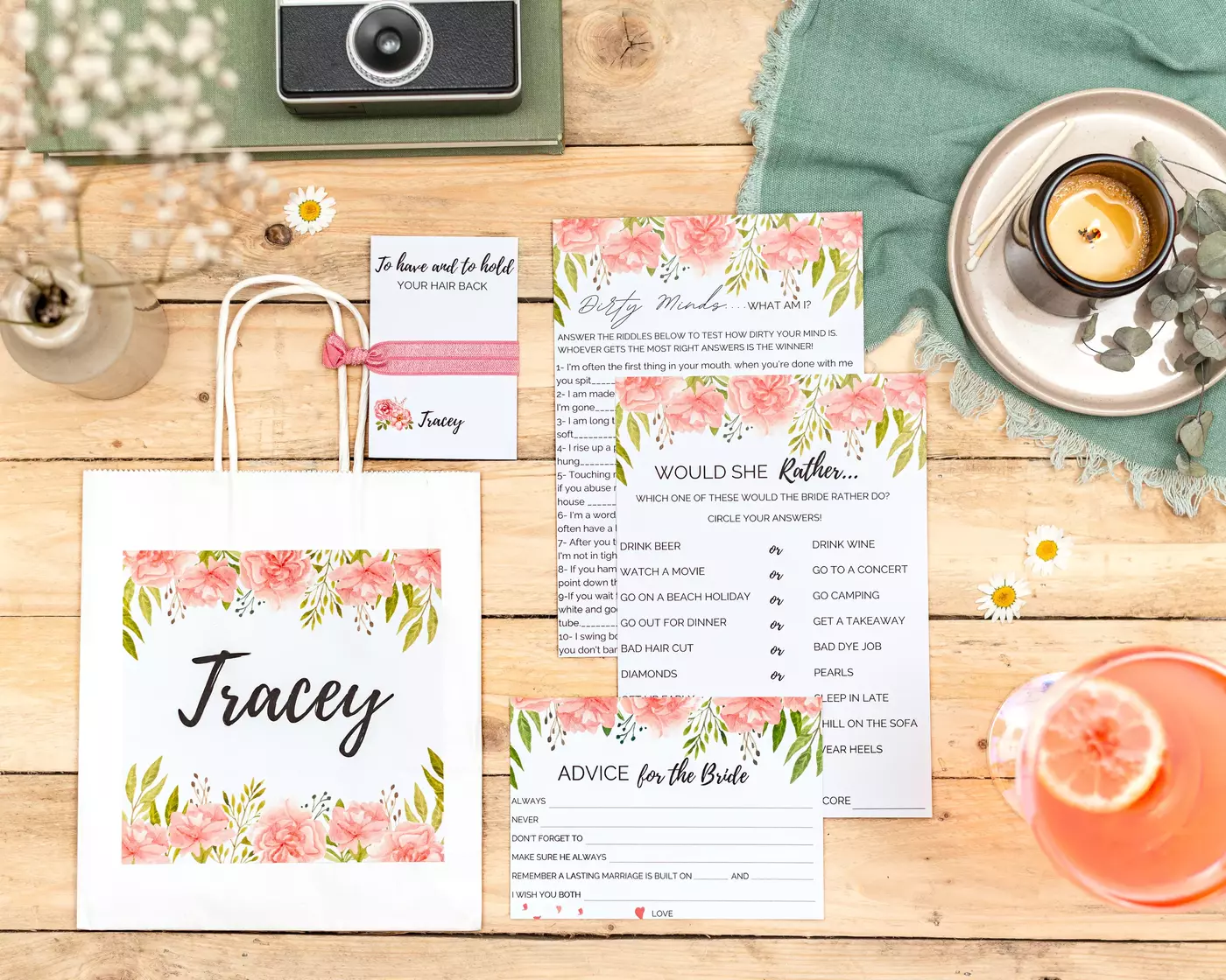 Each bag is personalised to each hen attendee, with the bride’s bag stating “The Bride” at the top. Please message with the attendee names or add these details to the personalisation box on this listing, stating which attendee is the bride.